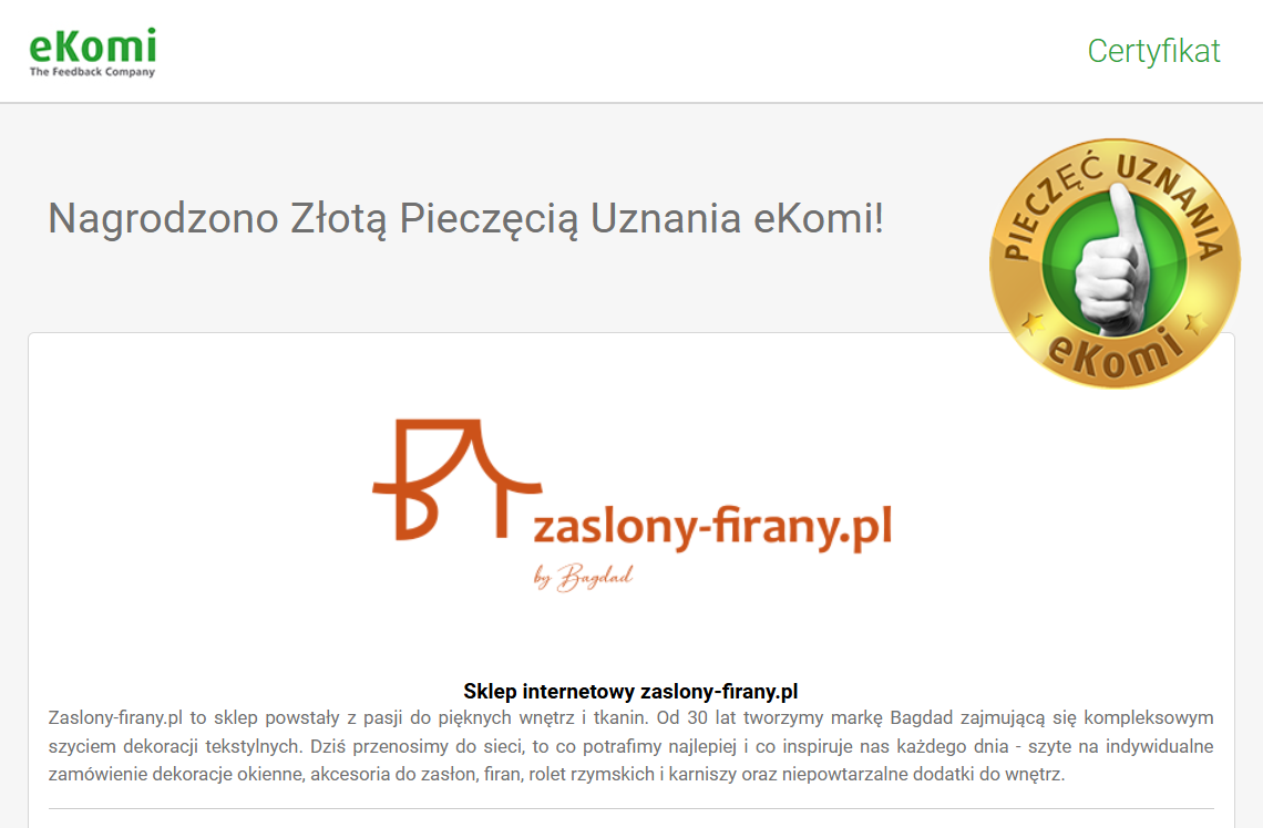 Otrzymaliśmy Złotą Pieczęć Uznania eKomi,
